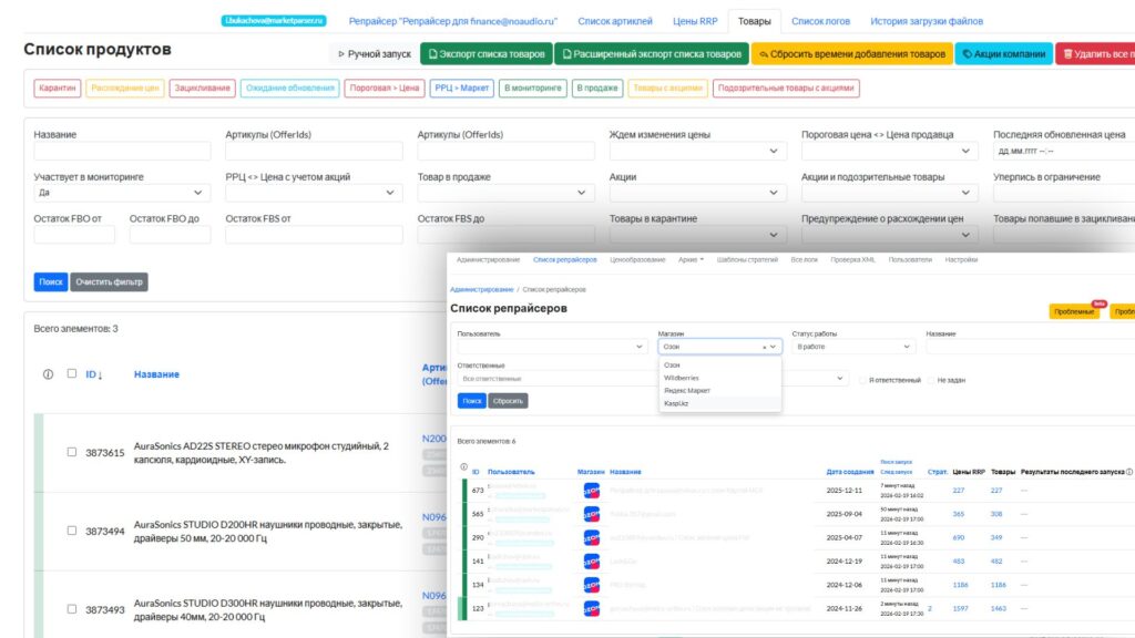 - Маркетплейсы: ЯндексМаркет, Авито, Ozon.ru, Price.ru, MegaMarket.ru, Wildberries, Kaspi.kz, onliner.by, 1k.by